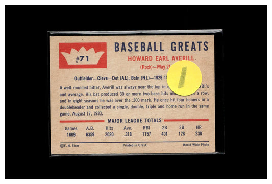 1960 Fleer Baseball Greats #71 Earl Averill 1